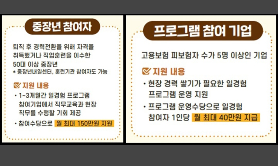 특히 참여 기간 동안 중장년에게는 월 최대 150만 원의 참여수당을 지급하며, 기업은 참여자 관리와 프로그램 운영에 필요한 비용으로 참여자 1인당 월 최대 40만 원을 지원받는다.