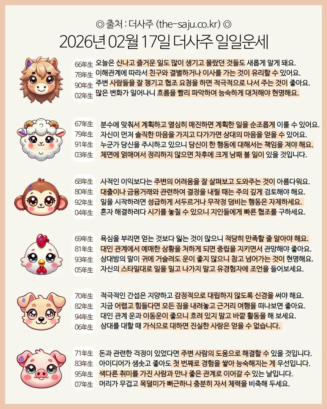 #2026년 병오년(丙午年)2월17일. 더사주.별자리.일일운세.띠별운세