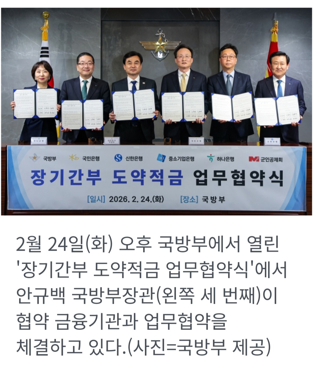 국방부는 24일 국방부 청사에서 국민은행, 신한은행, 중소기업은행, 하나은행, 군인공제회와 '장기간부 도약적금' 업무협약을 체결했다고 밝혔다.