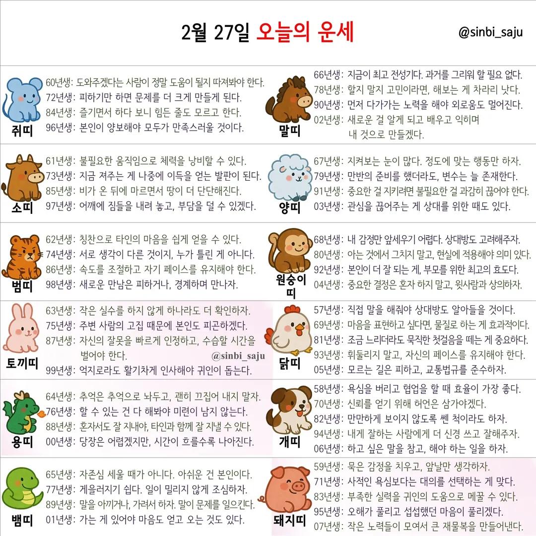 | #2026년 병오년(丙午年)2월28일. 더사주.별자리.일일운세.띠별운세 (0) | 2026.02.28 |