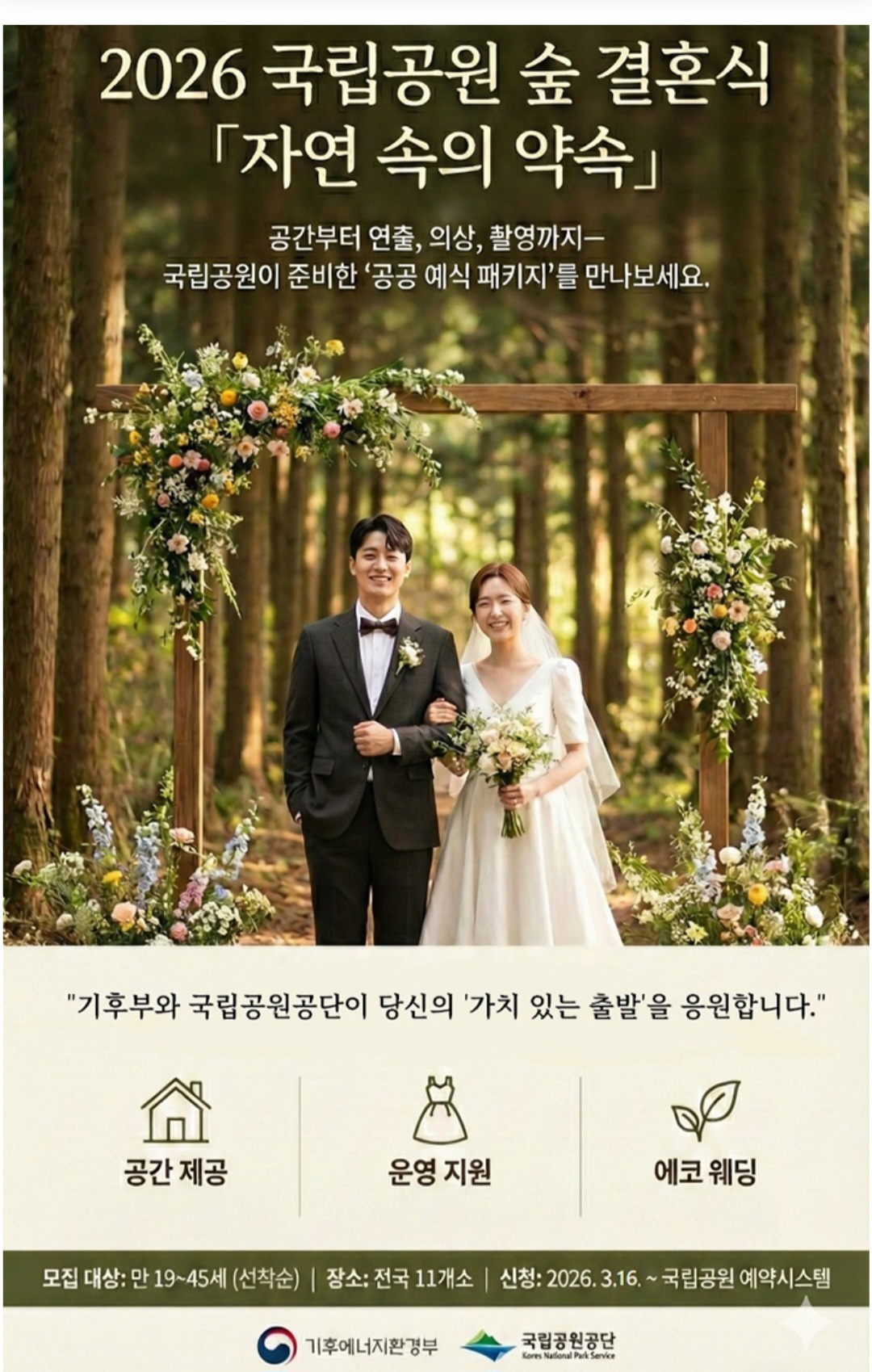 기후에너지환경부 산하 국립공원공단은 '고비용 예식' 문제 해결에 도움을 주고 친환경 결혼 문화를 확산하기 위해 '2026년 국립공원 숲 결혼식 지원' 서비스를 추진한다고 5일 밝혔다.