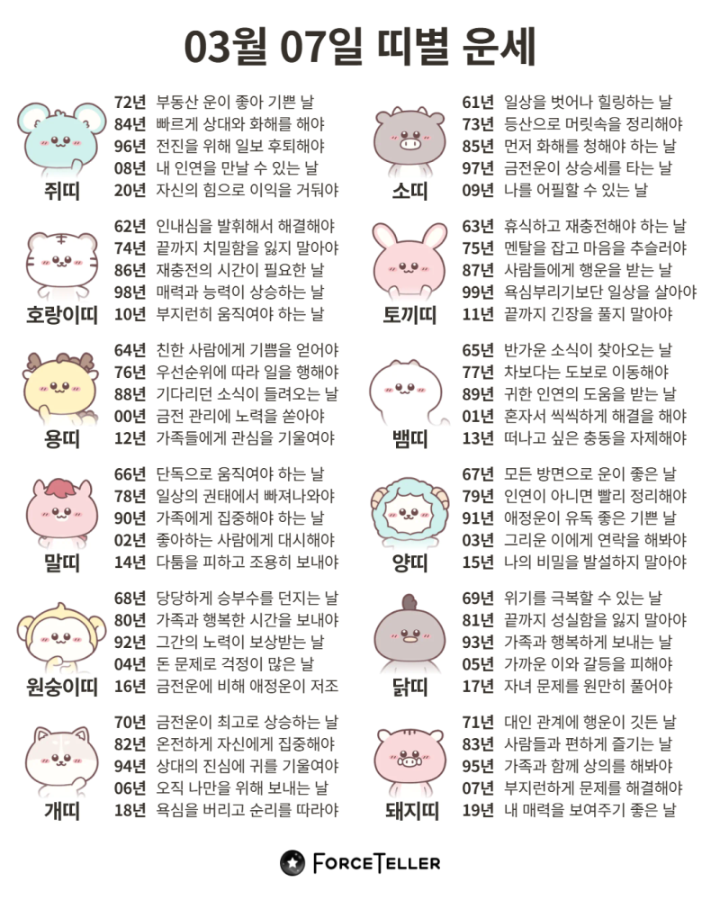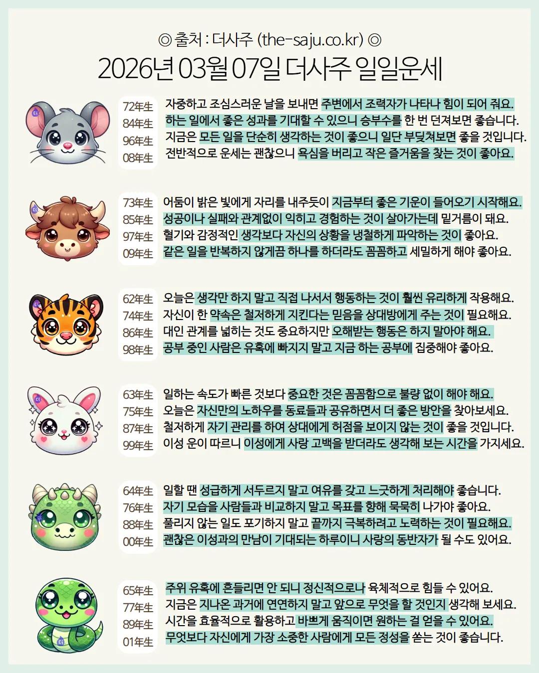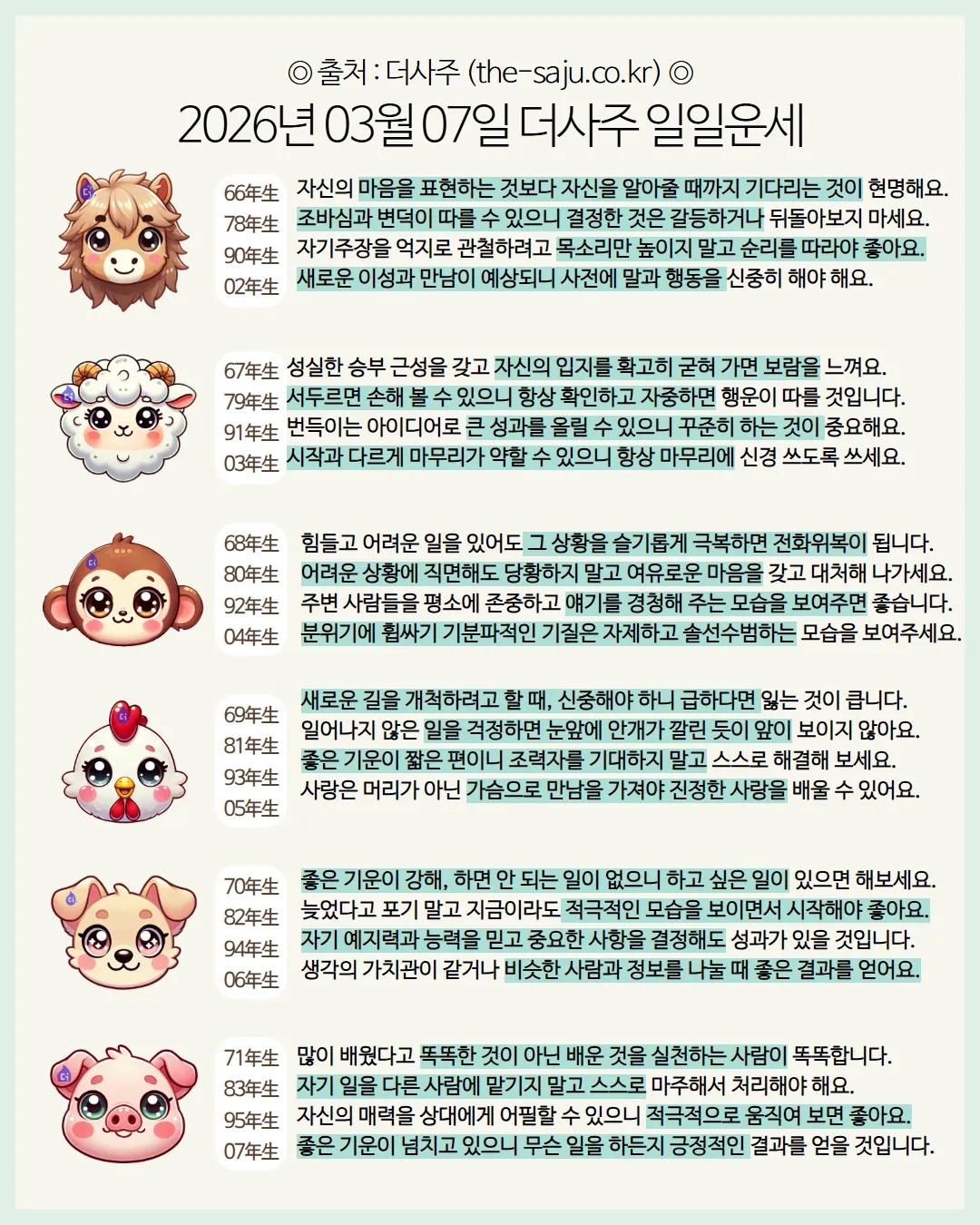 #2026년 병오년(丙午年)3월7일. 더사주.별자리.일일운세.띠별운세