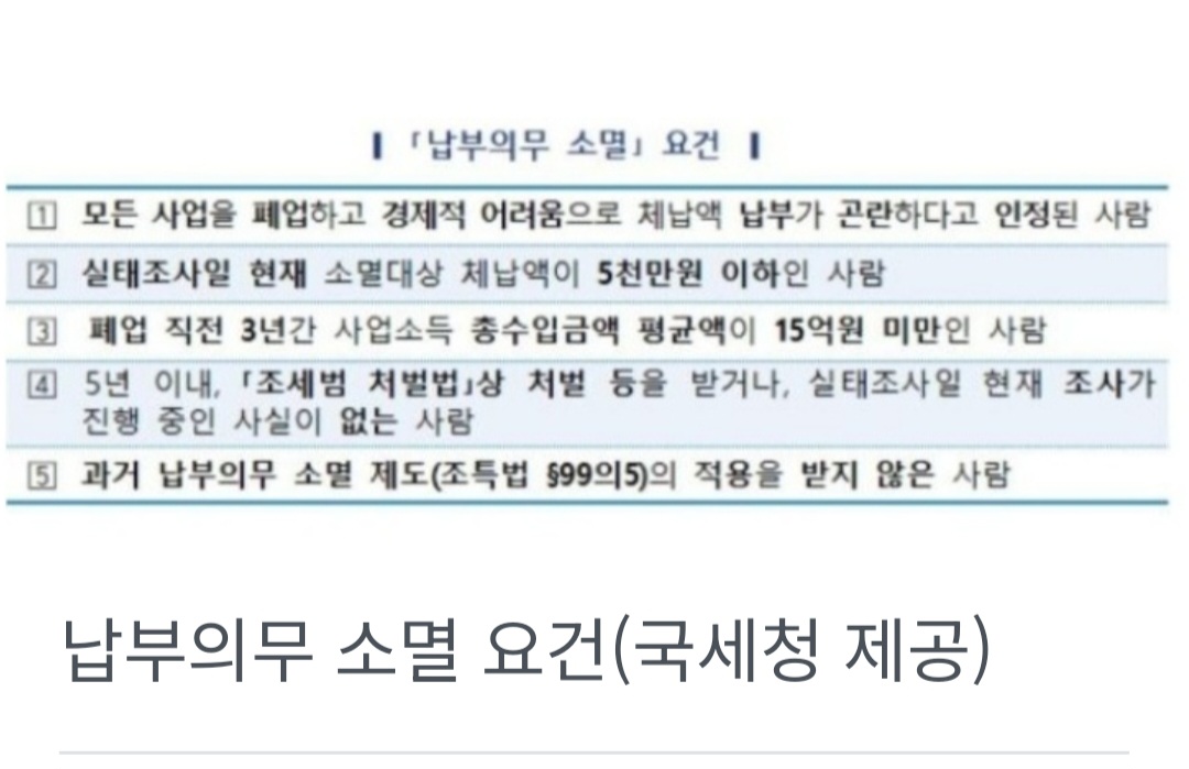 납부 의무가 소멸되려면 ▲모든 사업을 폐업하고 경제적 어려움으로 체납액 납부가 곤란하다고 인정된 사람 ▲실태 조사일 현재 소멸 대상 체납액이 5000만 원 이하 ▲폐업 직전 3년간 사업소득 총 수입금액 평균액이 15억 원 미만 ▲5년 이내 '조세범 처벌법'상 처벌 등을 받거나, 실태 조사일 현재 조사가 진행 중인 사실이 없는 사람 ▲과거 납부의무 소멸 제도(조특법 §99의5)의 적용을 받지 않은 사람 등 요건을 충족해야 한다.