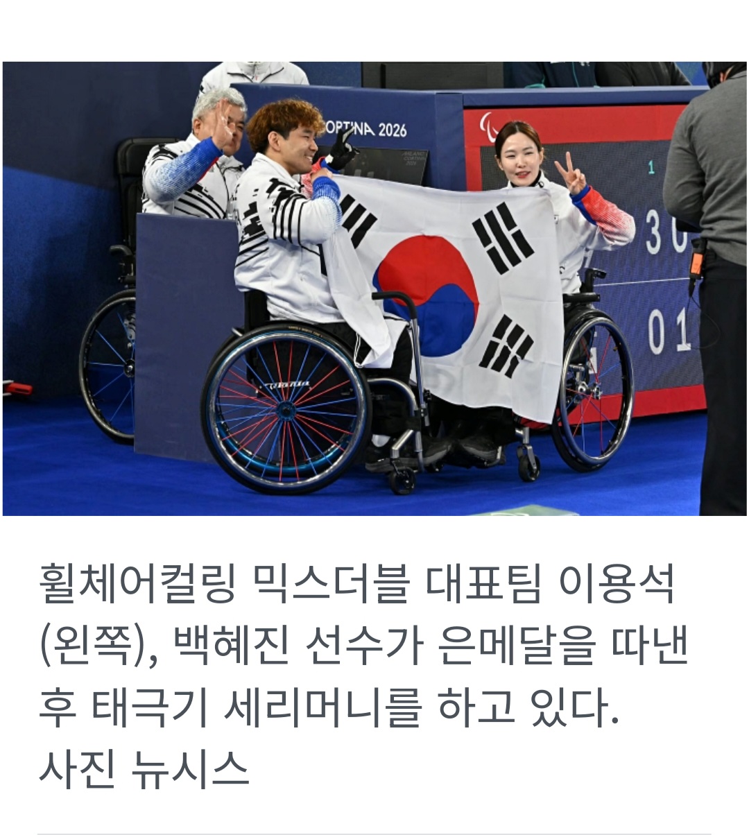 휠체어컬링 믹스더블 백혜진-이용석 조도 11일 은메달을 따내며 2010 밴쿠버 대회 이후 16년 만에 패럴림픽 시상대에 태극기를 올렸다.