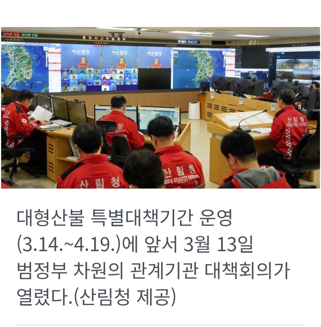 정부는 봄철 산불 위험에 대비해 오는14일부터 다음 달 19일까지 '대형산불 특별대책기간'으로 지정하고 범정부 대응체계를 본격 가동한다고 밝혔다.