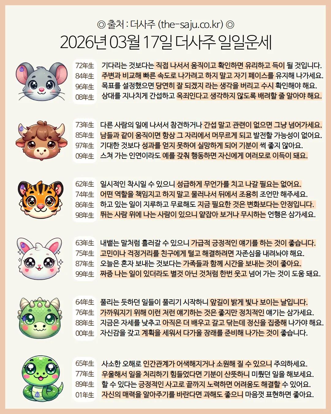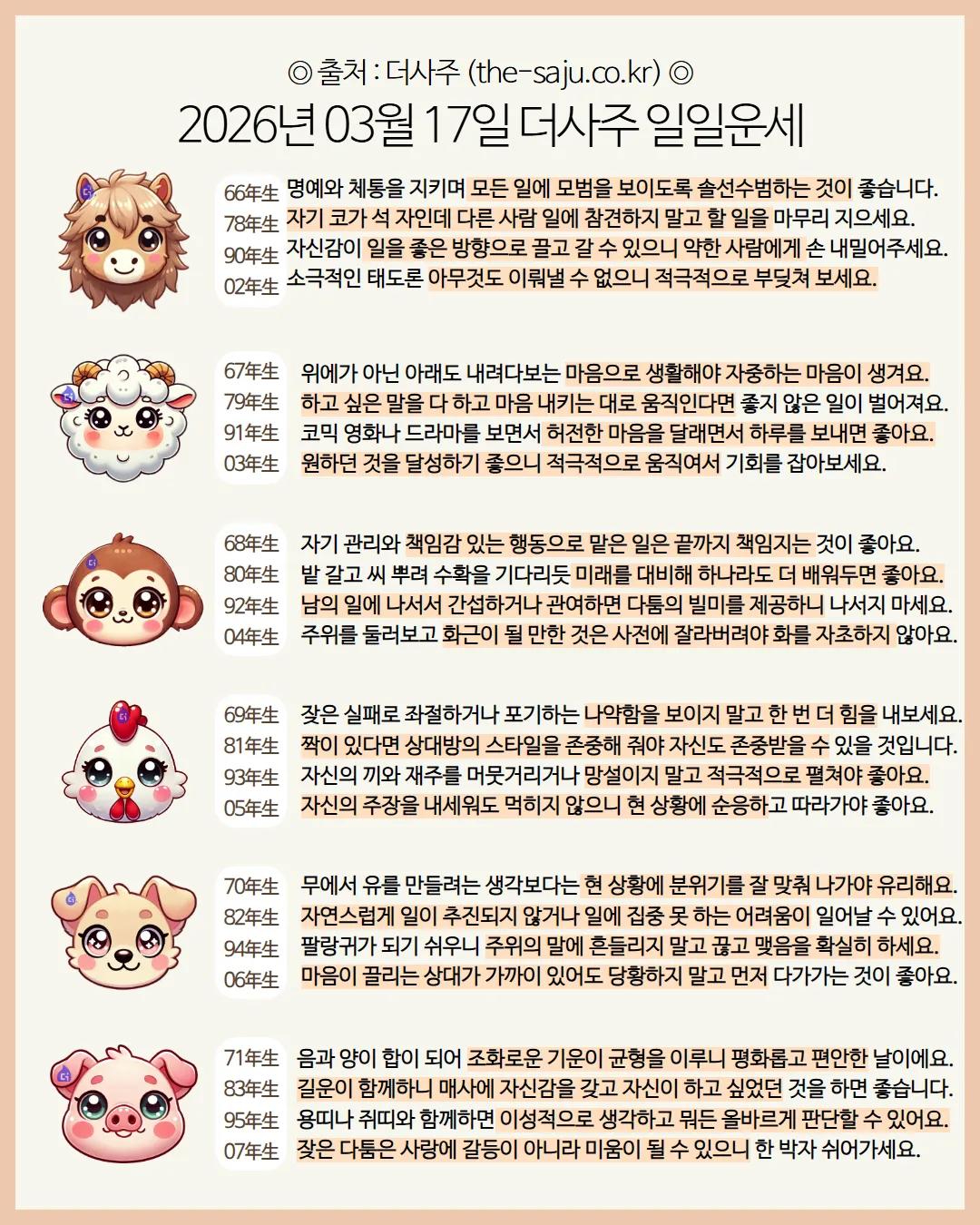#2026년 병오년(丙午年)3월17일. 더사주.별자리.일일운세.띠별운세