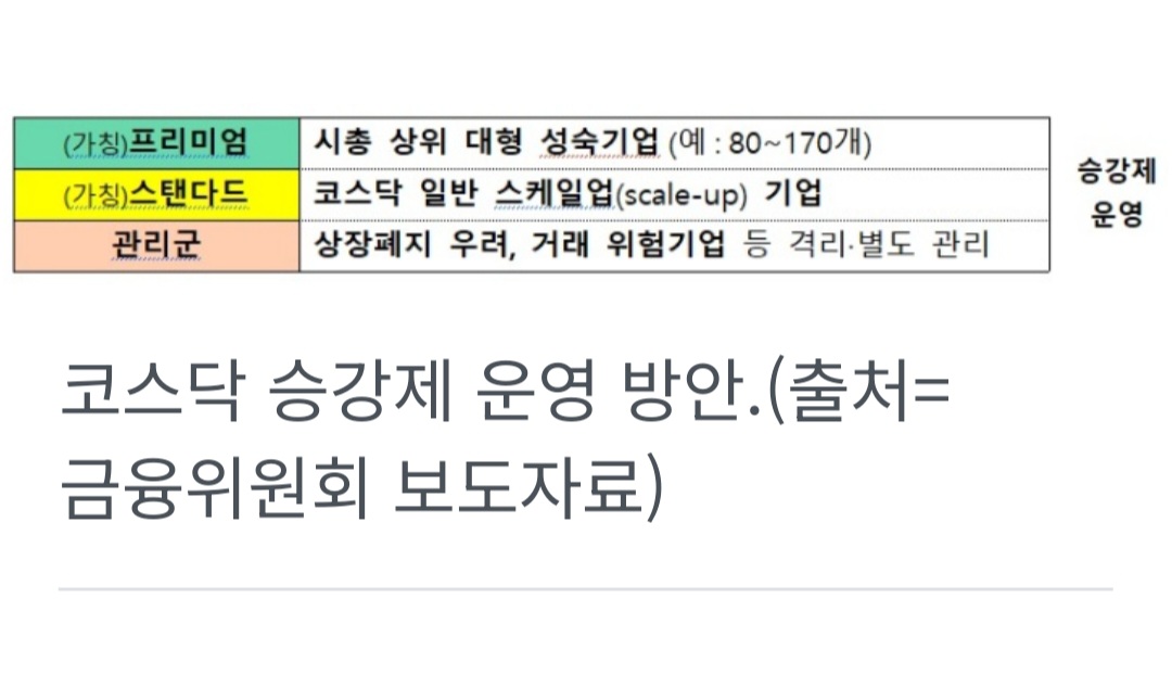 또한 코스닥 시장을 프리미엄·스탠다드(가칭) 세그먼트로 나누고 승강제를 운영해, 기업의 성장을 자극하고 시장 역동성을 제고한다.