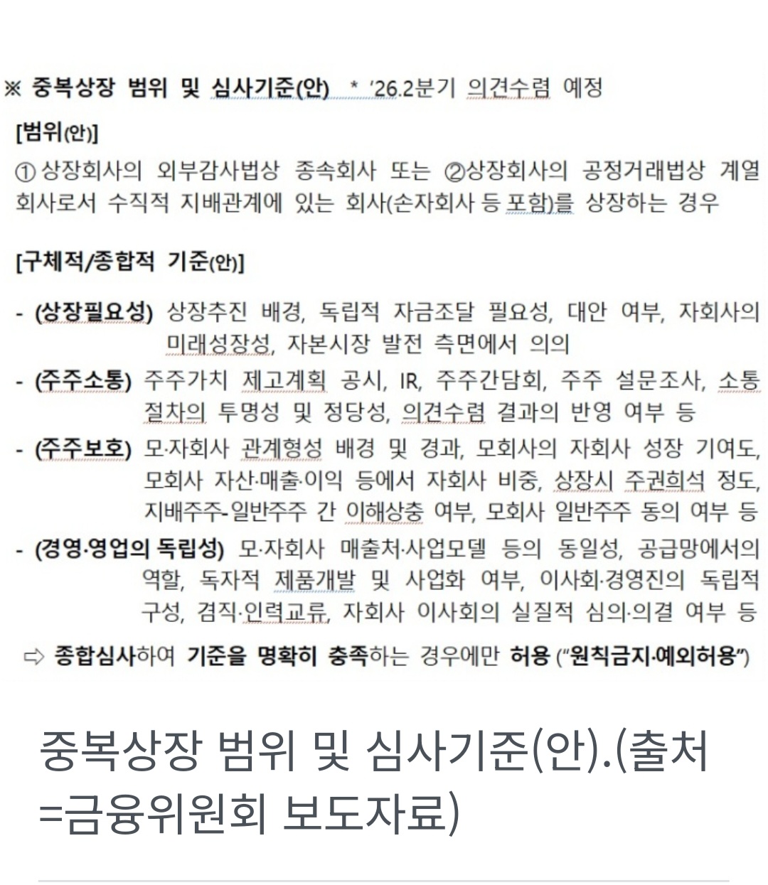 분할 뿐 아니라 '인수·신설한 자회사'도 실질적 지배력이 있으면 중복상장의 유형으로 심사하고, 심사를 위한 '종합적, 구체적 기준'을 신설하여 기준을 명확히 충족하는 예외적인 경우만 허용한다.