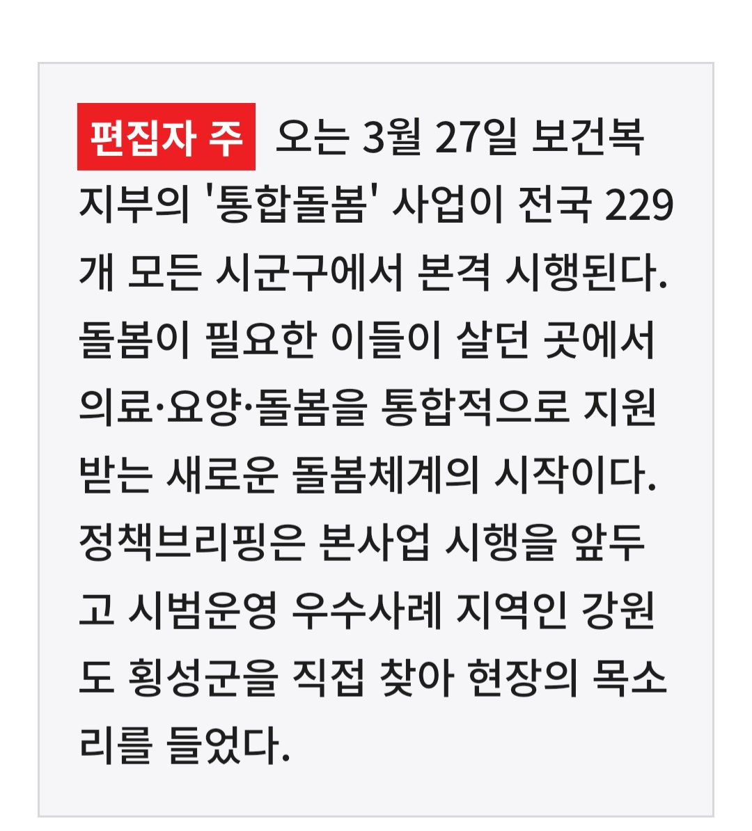 권혁남 횡성군 통합돌봄팀장은 "지역마다 상황이 다르기 때문에 동일한 방식보다는 지역에 맞는 운영이 중요하다"며 "현장과의 지속적인 소통을 통해 제도가 보완되길 기대한다"고 말했다.