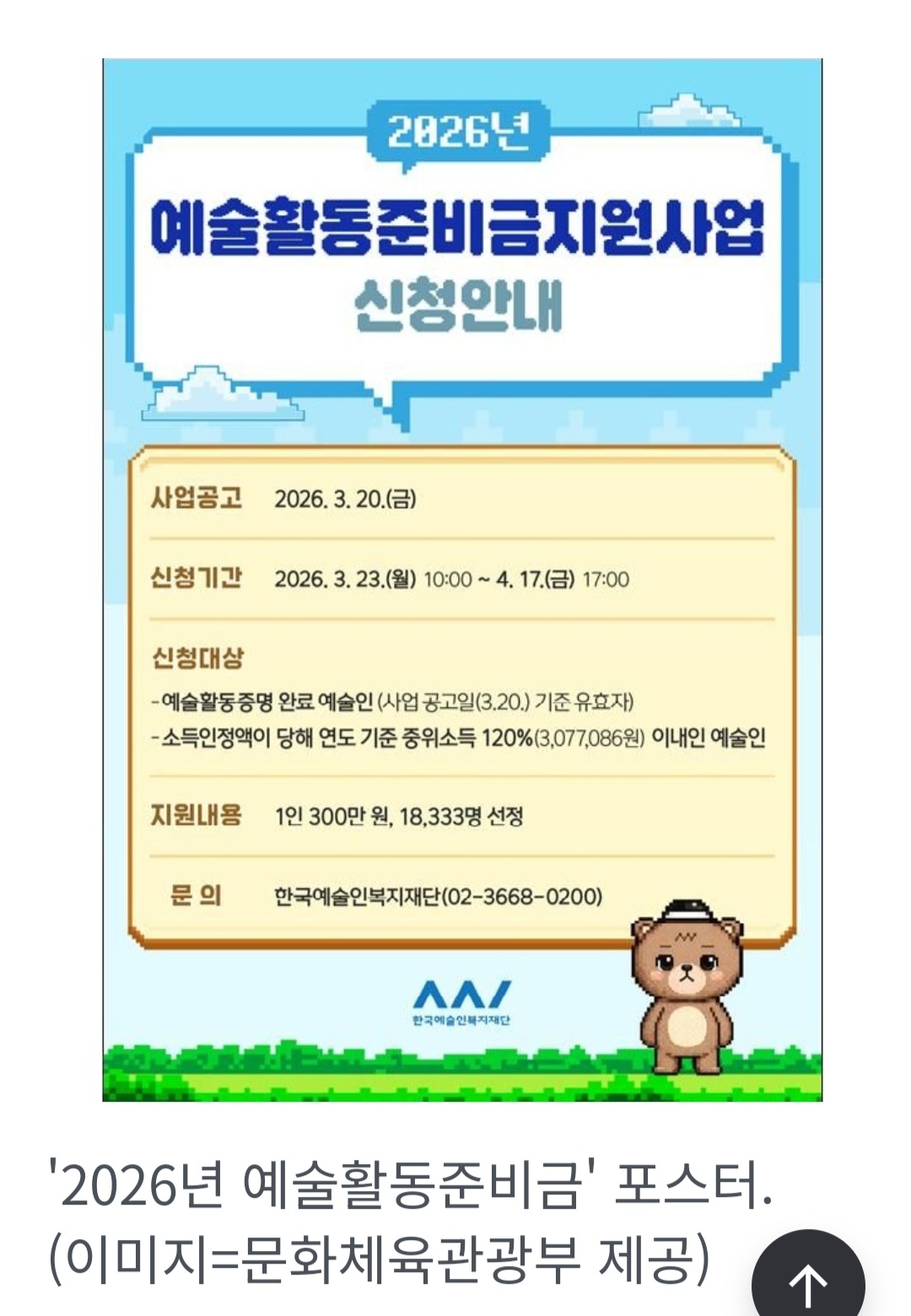 문화체육관광부는 한국예술인복지재단과 함께 오는 23일부터 내달 17일까지 '2026년 예술활동준비금' 지원 신청을 받는다고 20일 전했다.