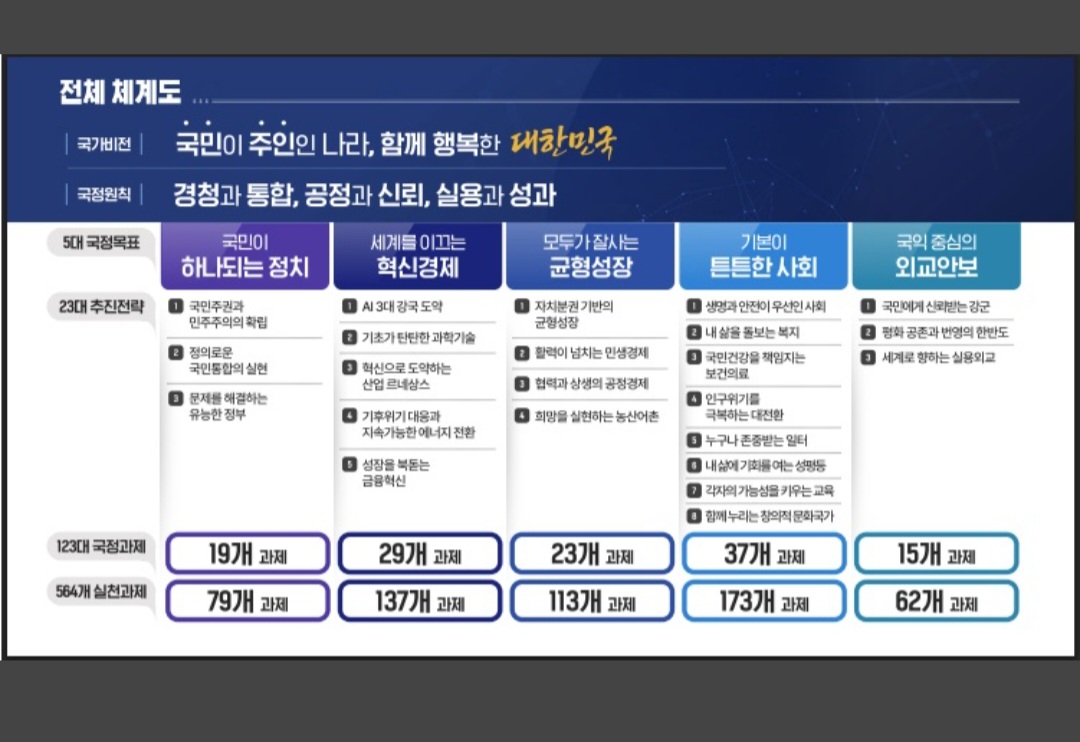 5대 국정목표는 ▴국민이 하나되는 정치 ▴세계를 이끄는 혁신경제 ▴모두가 잘사는 균형성장 ▴기본이 튼튼한 사회 ▴국익 중심의 외교안보로 정하고, 5대 국정목표 아래 23대 추진전략과 123대 국정과제를 제시했다.