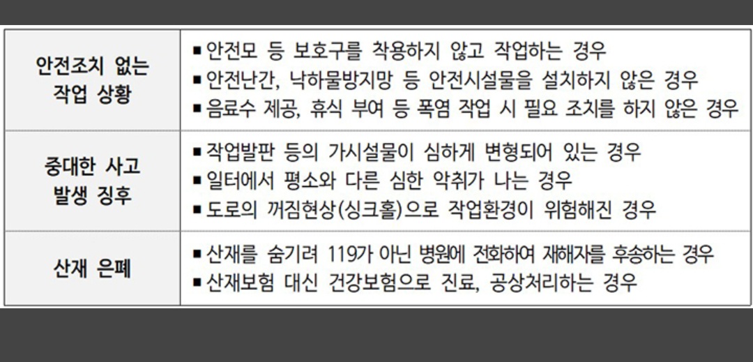 이에 안전조치 없이 이뤄지는 작업 상황, 붕괴·화재·누출 등 다수의 인명피해가 발생할 수 있는 중대한 사고 징후가 있는 경우, 산업재해 발생 사실을 숨기려고 하는 '산재 은폐' 등을 신고할 수 있다.