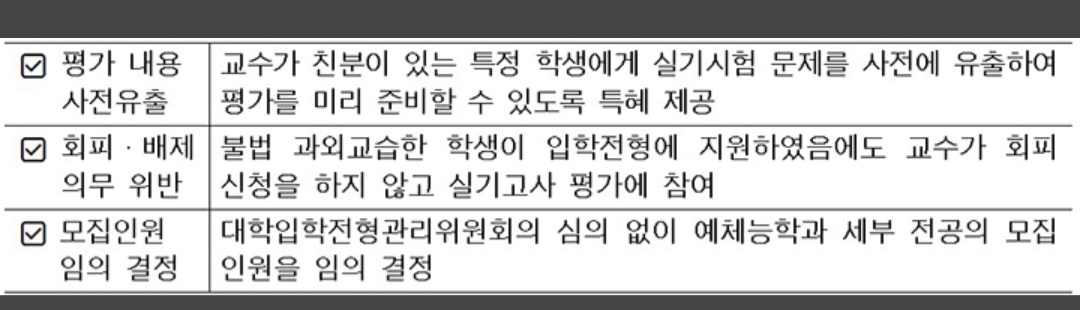 특히 음대 등 입시비리 대응방안 수립·시행 이후 예체능계 분야에서 공정한 대입 제도 운영의 중요성이 여전히 강조되고 있으므로 예체능계 분야의 입시비리는 더욱 철저히 조사할 예정이다.