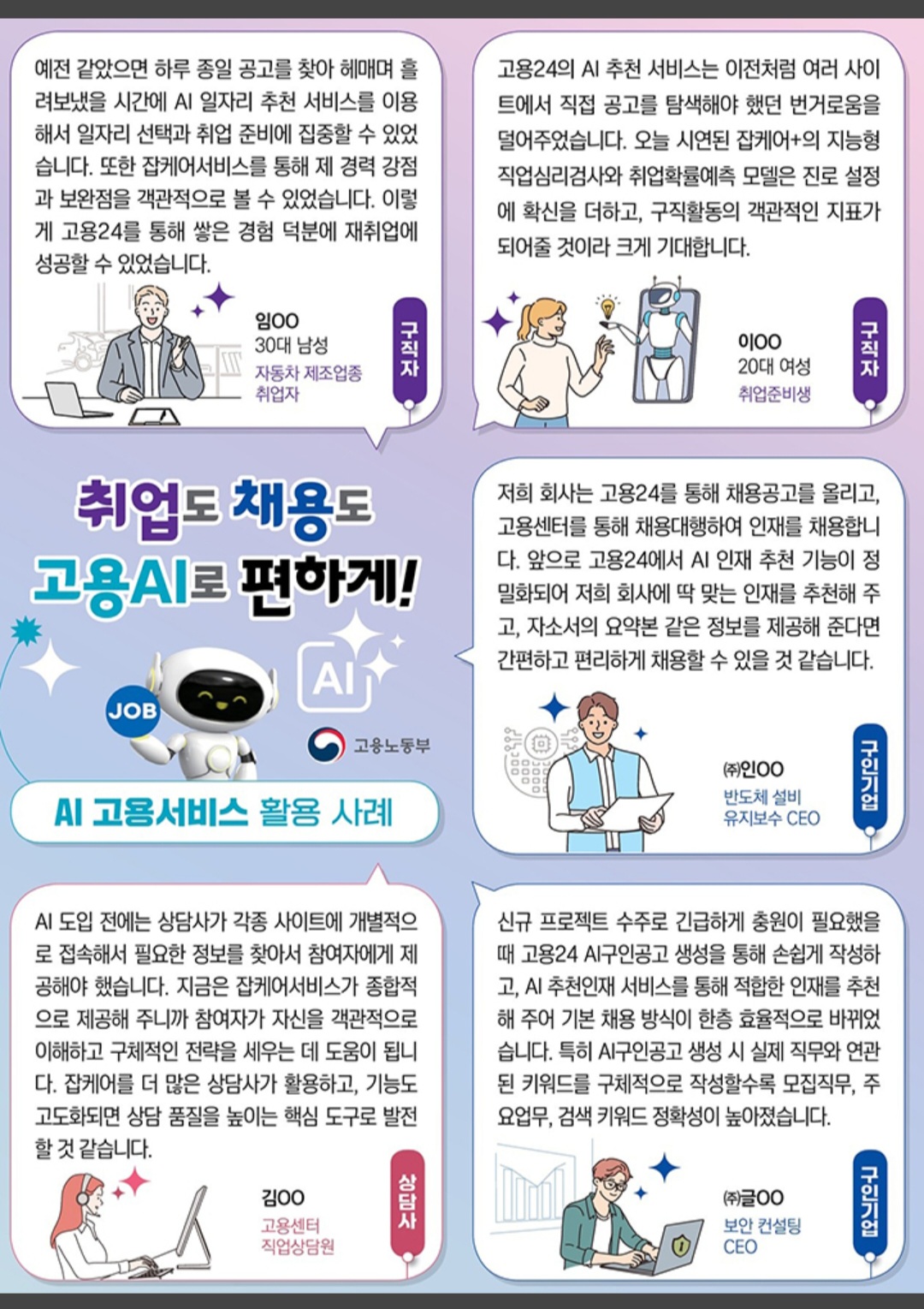 한편 AI 고용서비스를 실제 활용해 본 구직자와 기업들의 반응도 긍정적인데, 한 구직자는 "지능형 직업심리검사와 취업확률 예측으로 진로 설정에 확신을 얻었고, AI가 일자리·훈련·자격증을 맞춤 추천해 줘 취업준비 시간을 크게 줄일 수 있었다"고 말했다.