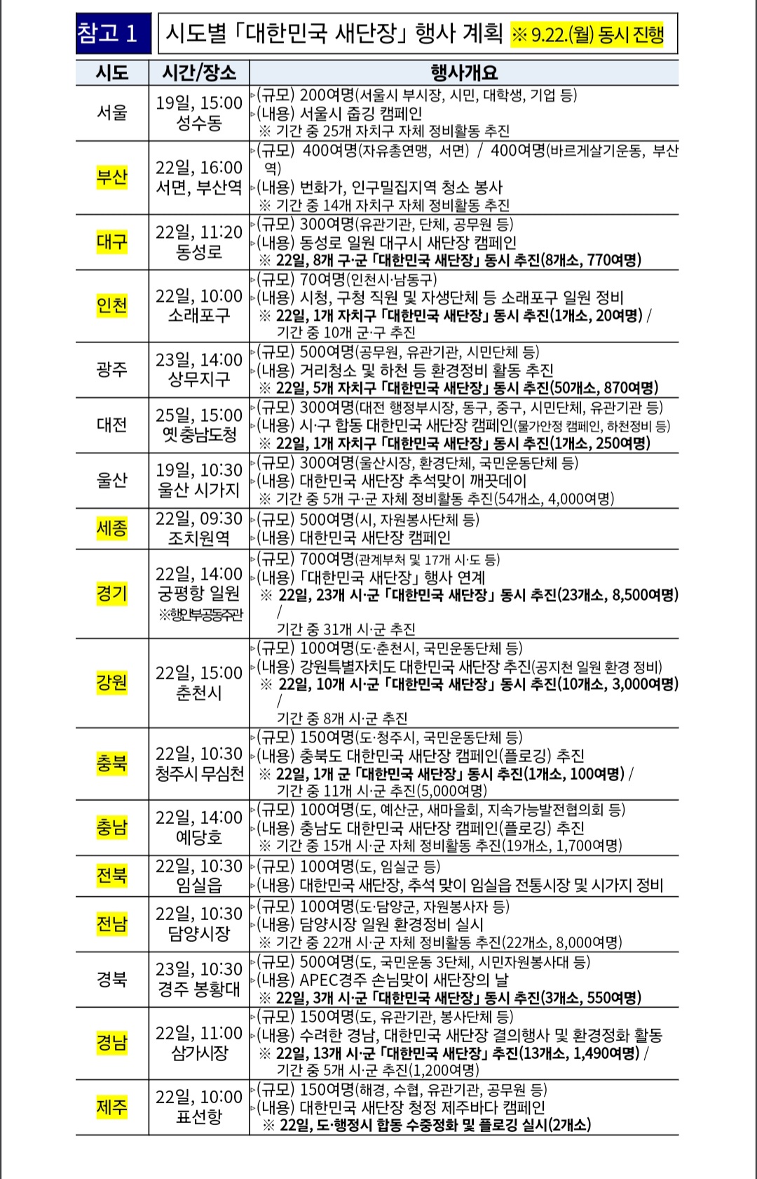 환경부는 소속·산하기관과 합동으로 대한민국 새 단장 캠페인을 진행하는 바 ▲하천하구 유역, 수해 피해지역, 국립공원 등 정화활동 ▲추석 연휴 환경부-지자체 합동 생활폐기물 집중 관리기간을 운영한다.