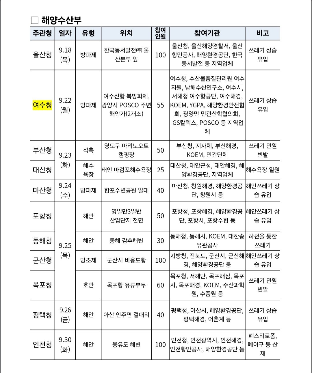 주요 해안가 및 방파제 구간에서는 지방해양수산청 주관으로 ▲울산(9.18.) ▲여수(9.22.) ▲부산·태안(9.23.) ▲마산(9.24.) ▲포항·동해·군산·목포(9.25.) ▲평택(9.26.) ▲인천(9.30.) 등에서 유관기관 합동 수거 행사를 진행한다.