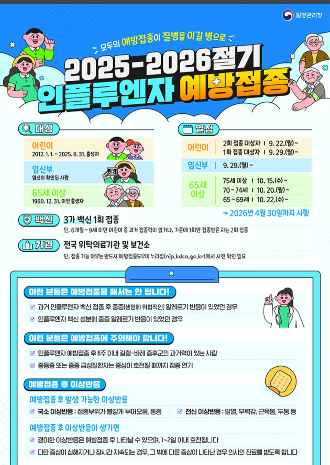 질병관리청은 22일부터 내년 4월 30일까지 '2025-2026절기 인플루엔자 국가예방접종'을 시작한다고 밝혔다.