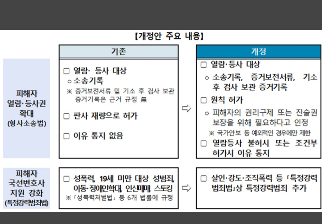 이번 개정으로 피해자는 법원이 보관 중인 형사재판기록뿐 아니라 증거보전서류, 기소 후 검사가 보관하는 증거기록까지 원칙적으로 열람·등사할 수 있게 됐다.