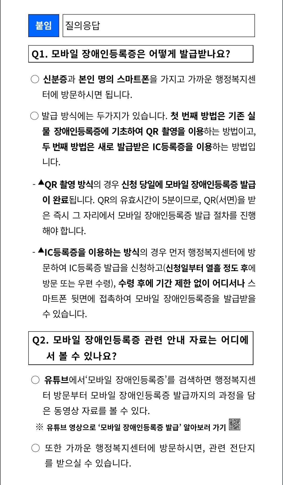 아울러 유튜브에서 '모바일 장애인등록증'을 검색하면 최국화 아나운서(KBS 제6기 장애인앵커)가 행정복지센터 방문부터 모바일 장애인등록증 발급까지 과정을 시연한 알기 쉬운 영상 자료를 볼 수 있다.