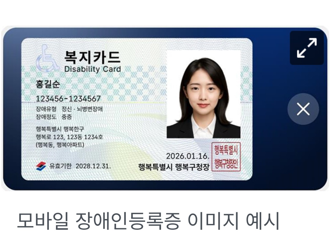 이에 플라스틱 재질의 장애인등록증을 발급받은 장애인은 추가로 모바일 장애인등록증을 신청할 수 있는 바, 신분증과 본인 명의의 스마트폰을 가지고 가까운 행정복지센터에 방문하면 된다.