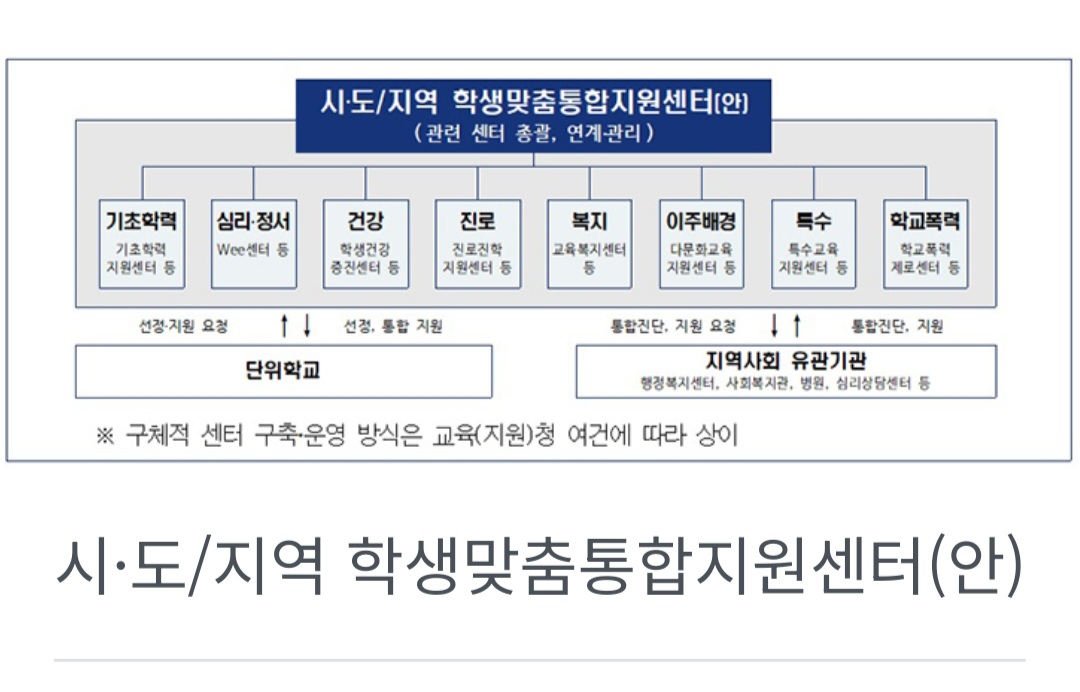 특히 교육(지원)청 내 설치하는 학생맞춤통합지원센터는 기초학력, 심리·정서, 진로 등 학생 지원과 관련된 여러 센터·사업을 총괄·조정하게 된다.