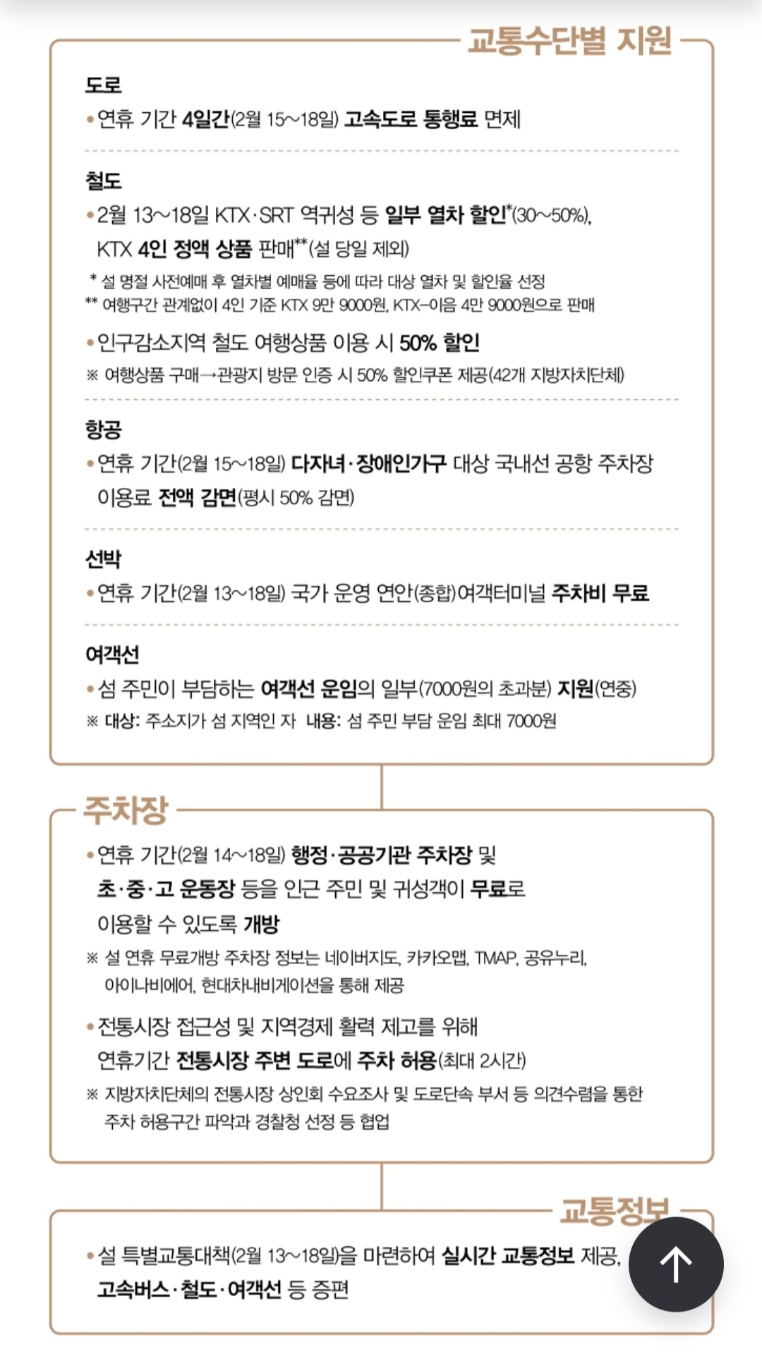 이용자 편의를 위해 2월 15일부터 18일까지 나흘간 전국 고속도로 통행료를 면제한다. 졸음쉼터와 휴게소를 확충하고 화장실과 서비스 인력을 대폭 늘린다. 철도는 역귀성 할인과 여행상품 연계 할인을 시행하고 교통약자를 위한 자동발매기와 편의물품을 확대 배치한다. 공항은 출국장을 조기 개방하고 실시간 대기 현황을 공개하며 여객선은 운항 예보와 임시주차장 확보로 혼잡을 줄인다.