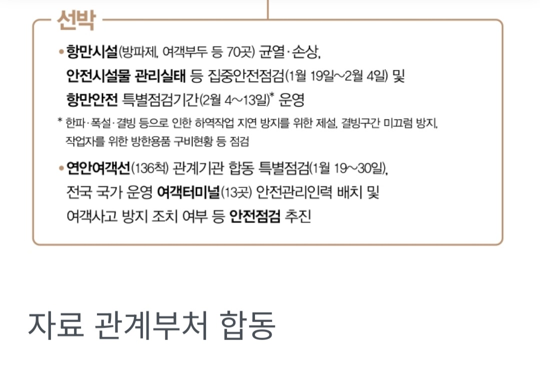 연휴를 앞두고 도로·철도·항공·선박 등 이동수단별 안전대책도 사전에 점검한다. 혼잡구간 관리와 실시간 교통정보 제공, 항공기 운항과 철도 차량·시설에 대한 특별 점검을 통해 이동 과정에서의 사고 위험을 최소화한다. 항만과 연안여객선에 대해서도 집중 안전점검과 현장인력 배치를 강화한다.