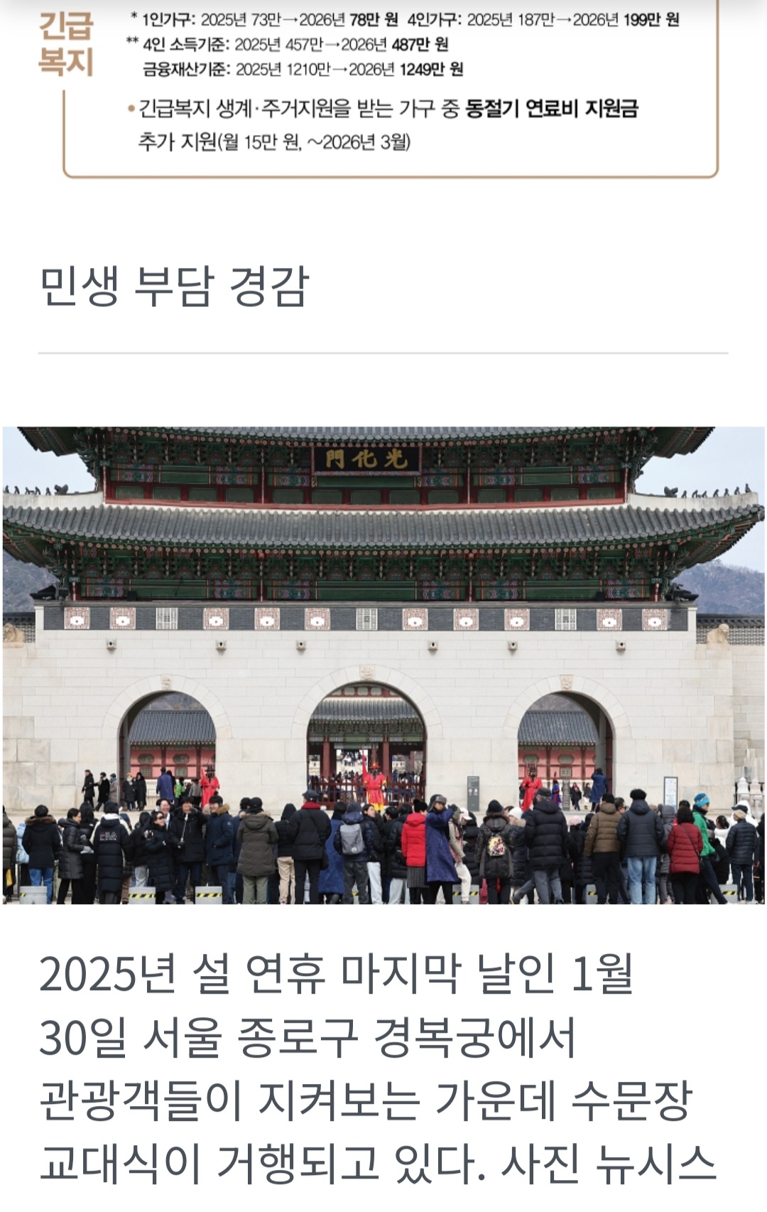 생활비 부담 완화 대책도 병행한다. 저소득층을 대상으로 생계급여와 장애수당 등 28종의 복지급여 1조 6000억 원을 설 전에 앞당겨 지급한다. 문화누리카드는 조기 재충전과 신규 발급을 통해 취약계층의 문화·관광·체육 활동 지원을 확대한다. 유류세 인하와 유가연동보조금 지급을 연장하고 에너지바우처 추가 지원과 사회복지시설 난방비 지원으로 겨울철 에너지 부담을 줄인다.